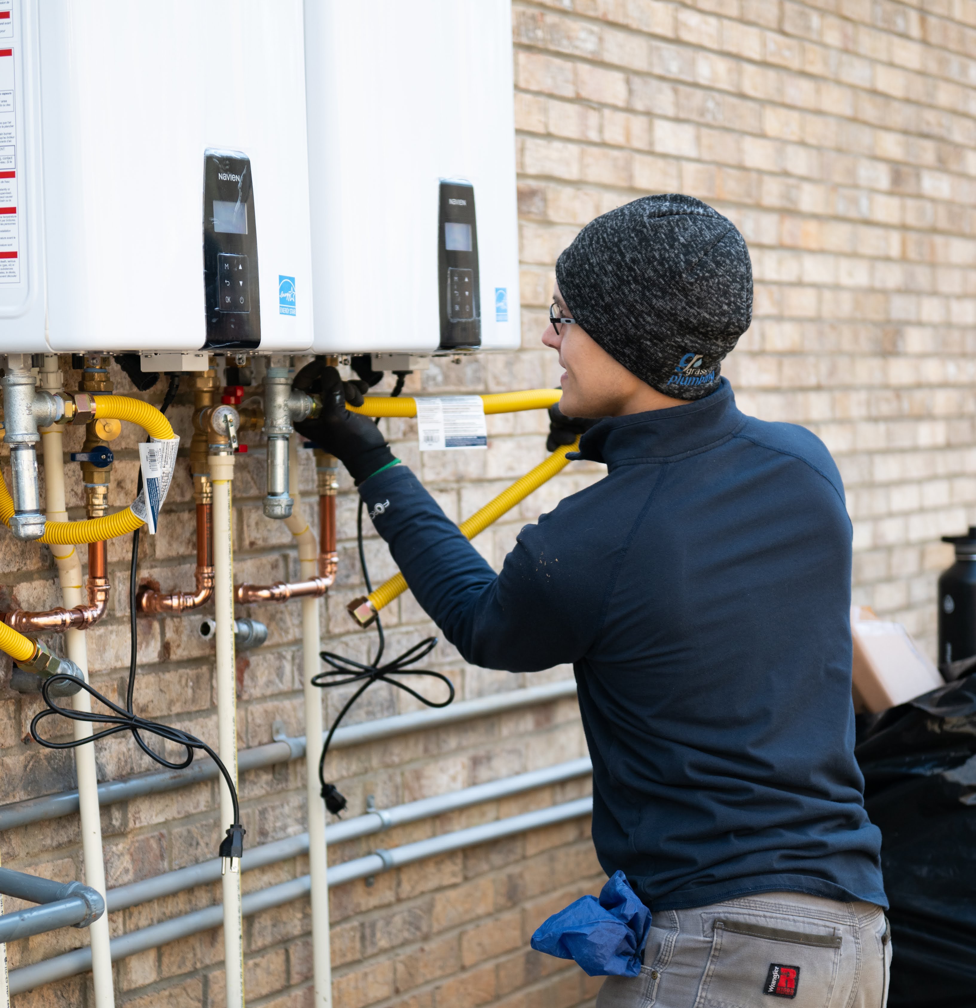 Plumber working on a copper pipe